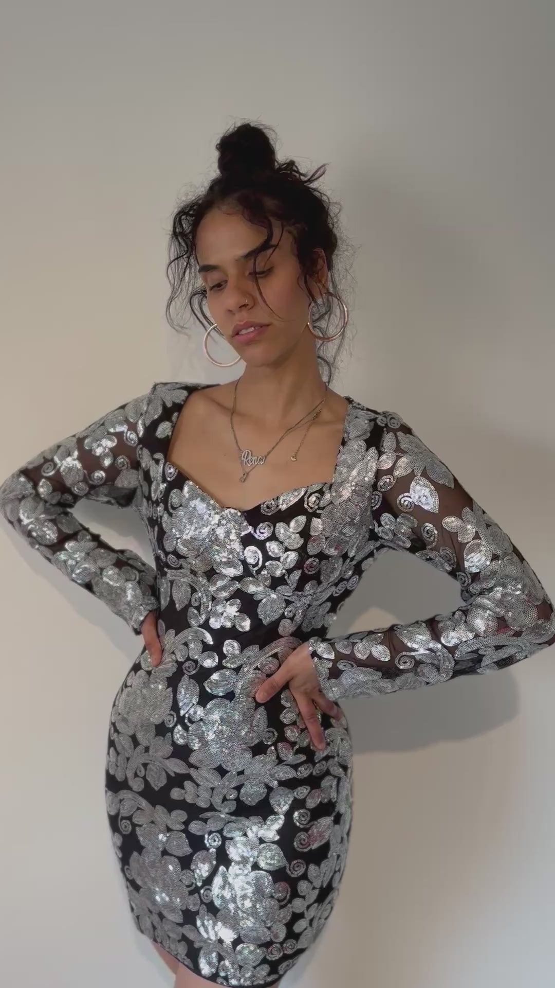 Questo abito floreale corto presenta un elegante ricamo lucido e maniche lunghe trasparenti, perfetto per un look elegante e sofisticato. Aggiungi un tocco di glamour al tuo outfit con questo abito.