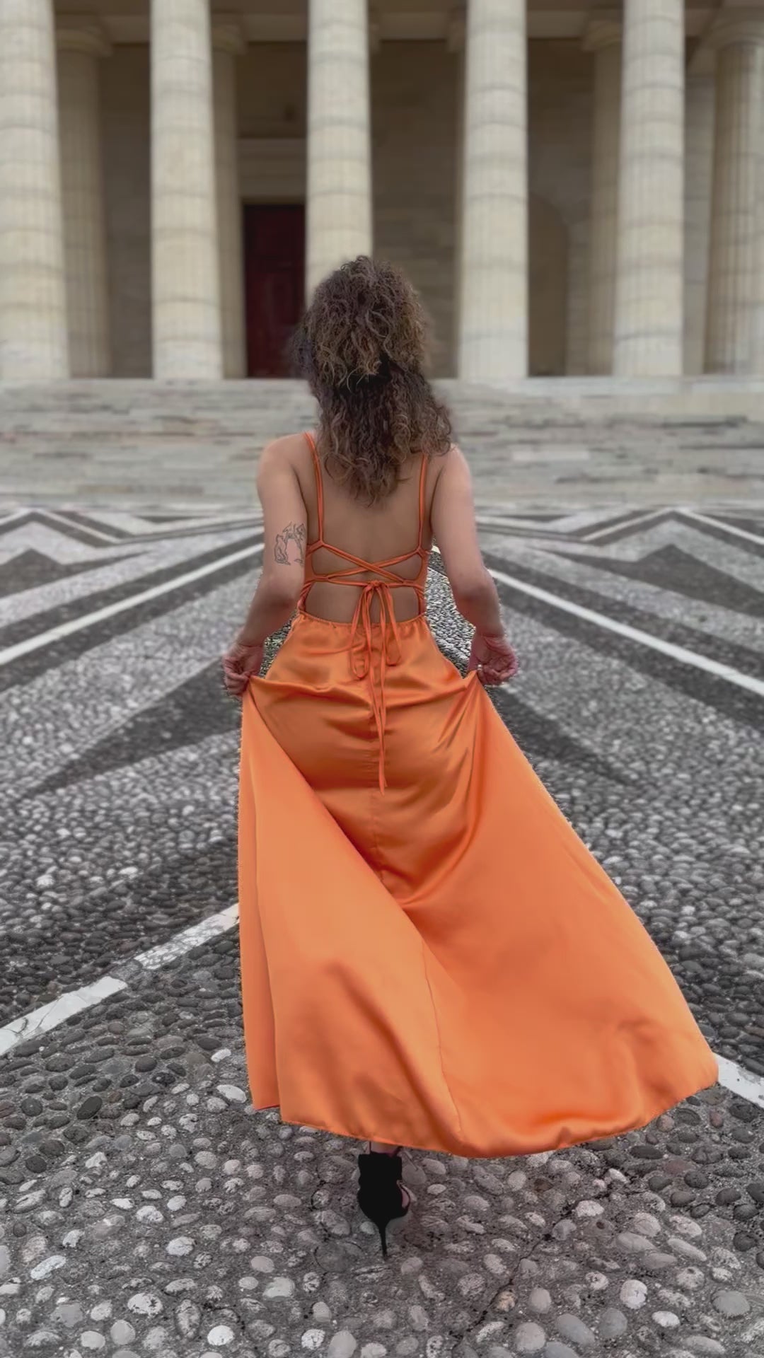 Il nostro Abito Mia è perfetto per ogni occasione. Realizzato con un elegante tessuto arancione, presenta uno spacco sulla gamba che dona un tocco di sensualità. Il design principesco e la chiusura regolabile con i lacci dietro garantiscono una vestibilità perfetta per ogni corpo.